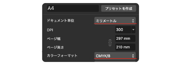 ドキュメントのサイズはA4、単位をミリメートル、カラーをCMYKで作成