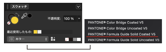 右側メニューのスウォッチ>カラーからPANTONE Solid Coated V5を選択