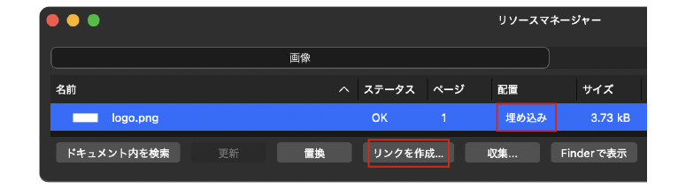 配置した画像が「埋め込み」になっていない場合はリンク作成部分が「埋め込みボタン」になります。